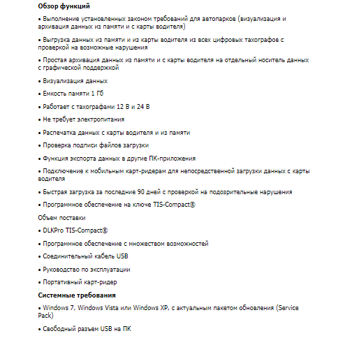 DLKPro TIS-Compact® представляет собой практичное комплексное решение для управления данными с множеством возможностей. Комплект содержит все, что необходимо предприятию, перевозчику или любому другому участнику тахографического контроля для выполнения установленных законом требований как ЕСТР, так и российского законодательства относительно национальной системы тахографии (тахографы СКЗИ).